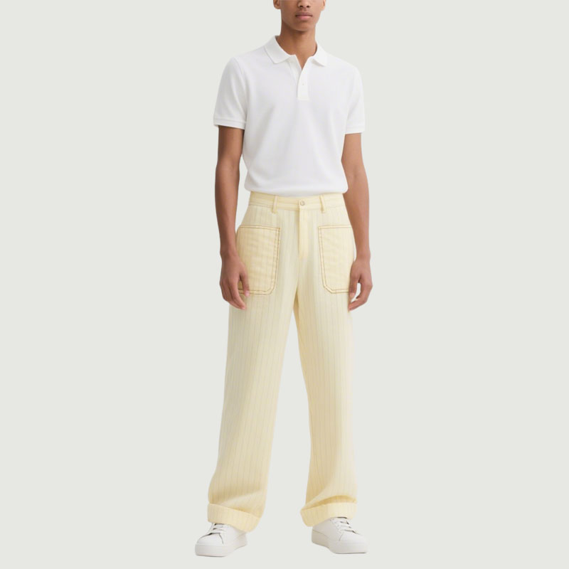 Relaxed Comfort FitDesigned with a roomy, wide-leg silhouette, these pants offer exceptional comfort and unrestricted movement, perfect for all-day wear. Premium FabricMade from high-quality blended materials, the fabric is soft, breathable, and durable—ideal for year-round use. Timeless & Versatile StyleCombining a laid-back feel with a touch of sophistication, these pants are easy to style with … Read More "Men’s Light Yellow Vertical Stripe Wide Leg Work Pants Casual"