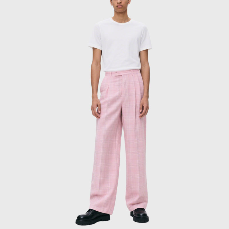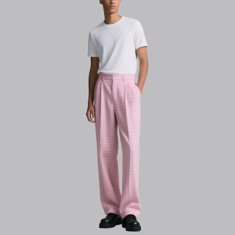 Men’s Pink & White Checkered Wide Leg Pants Relaxed Fit Casual Trousers