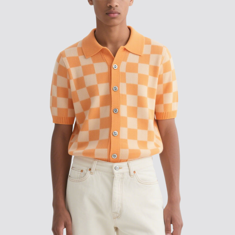Men’s Orange Checkered Knitted Polo Shirt Short Sleeve Trendy Look