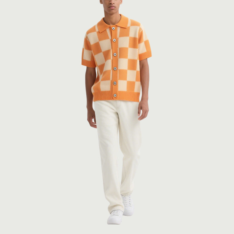 Men’s Orange Checkered Knitted Short Sleeve Shirt Trendy Soft Knit