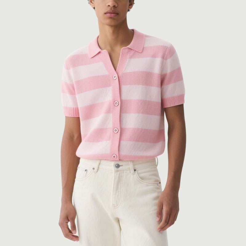 Men’s Pink Striped Knitted Short Sleeve Shirt Soft Casual Chic