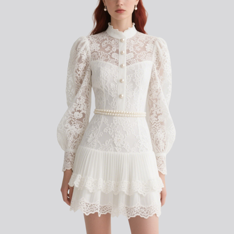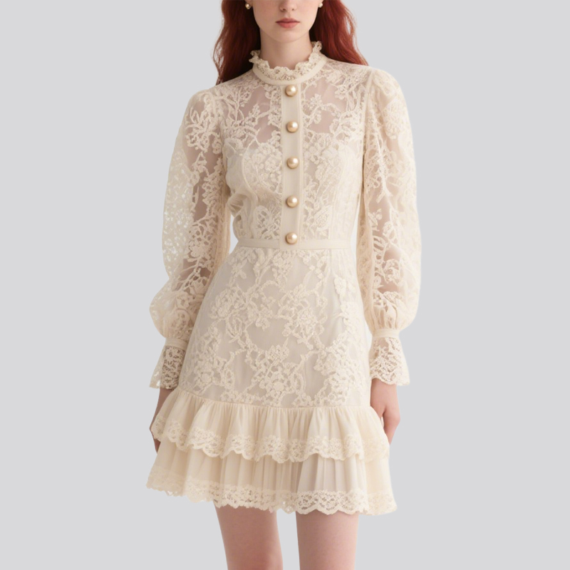 Women’s Elegant Long-Sleeved Dress with Floral Lace Trim