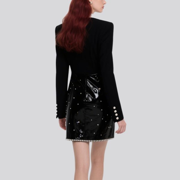 The dress hits just above the knee, revealing slender calves and visually lengthening the legs for a more elevated look.